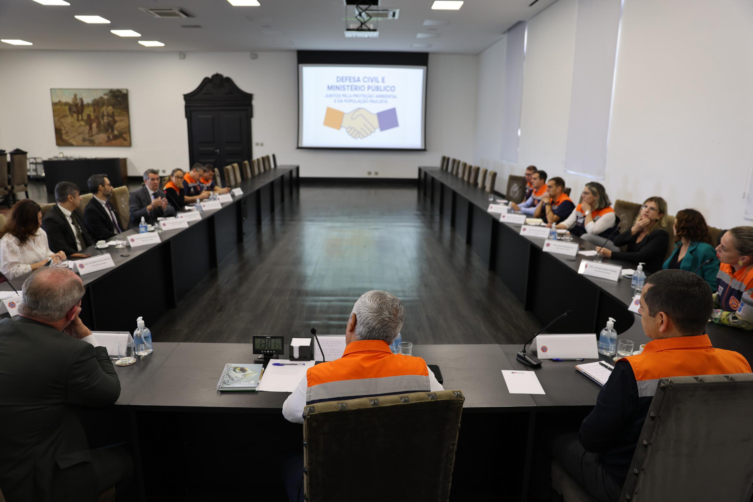 A Defesa Civil do Estado de São Paulo e o Ministério Público, por meio do Grupo de Atuação Especial de Defesa do Meio Ambiente (Gaema), realizaram nesta quinta-feira (18), no Palácio dos Bandeirantes, uma reunião de alinhamento estratégico voltada ao enfrentamento das mudanças climáticas. O encontro reuniu o coordenador estadual do Gaema, Luiz Fernando Rocha, promotores dos núcleos regionais, além do coordenador estadual de Proteção e Defesa Civil, coronel Henguel Ricardo Pereira, e diretores do órgão.
